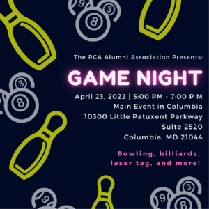 Join us on Saturday, April 23, 2022 at 5:00 PM, for a Game Night at Main Event in Columbia, MD. This event will include bowling,…