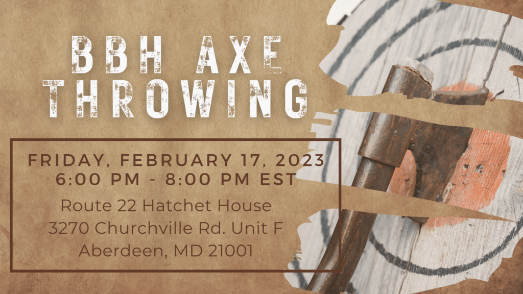 Join us on Friday, February 17th, 2023, from 6pm to 8pm for a night of Axe Throwing at Route 22 Hatchet House!
