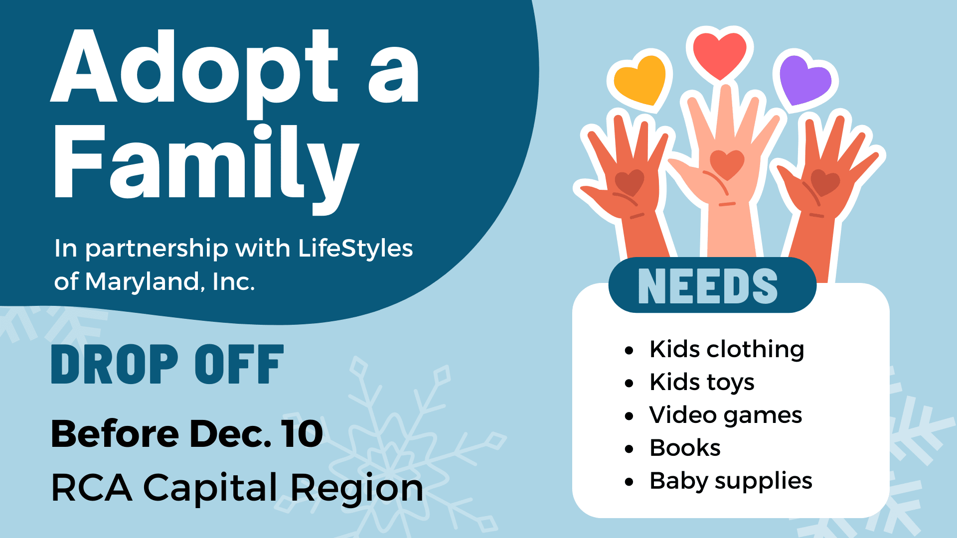 We are happy to announce that Recovery Centers of America at Capital Region has partnered with LifeStyles of Maryland, Inc. to adopt two special families for the holidays. Alumni and the community are invited to drop of items starting November 9th, 2022, until December 10th 2022.