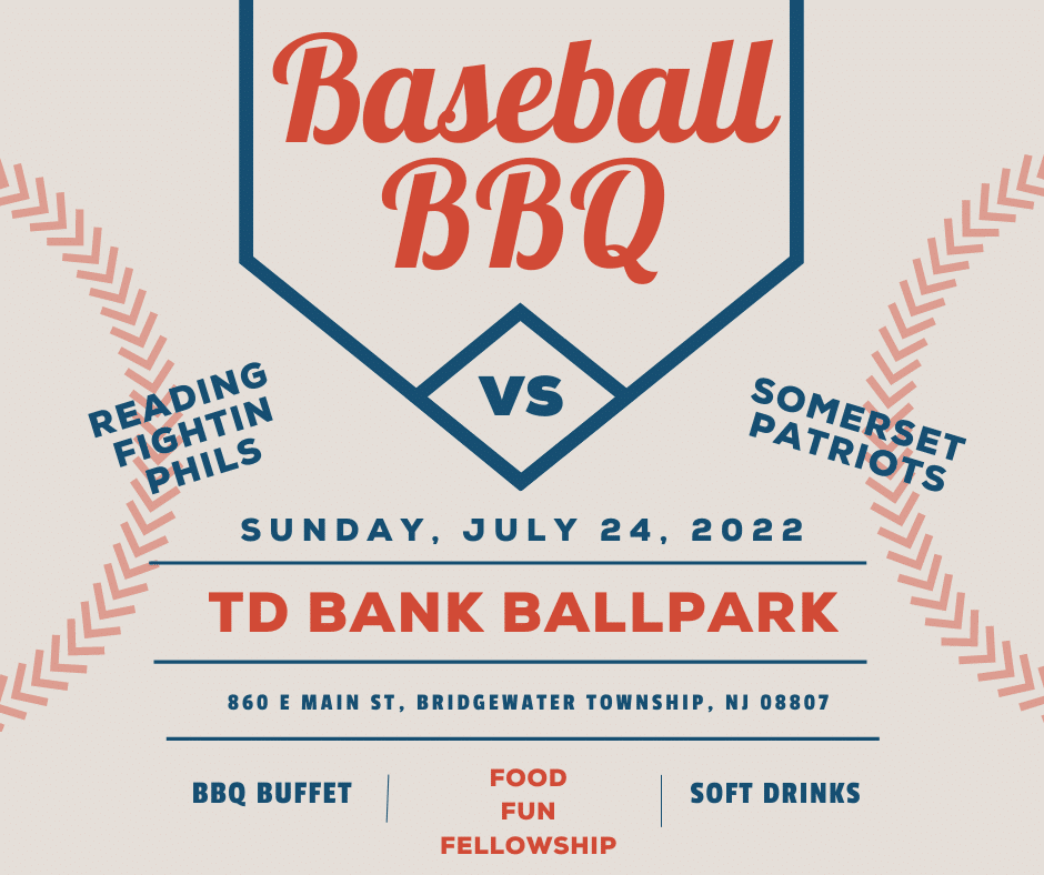 Join us Sunday July 24th for a Ballpark BBQ! Relax and enjoy an evening of food, fun, and fellowship while watching the Somerset Patriots play the Reading Fightin Phils!