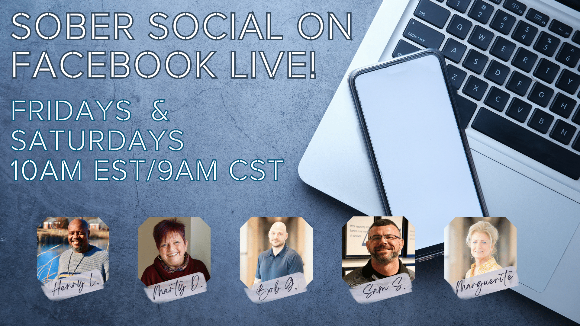 Join us every Friday and Saturday on the Recovery Centers of America Alumni Facebook page as we Go Live starting at 10:00 AM EST/9AM CST with Sober Social. Hear from Alumni Coordinators, Henry L., Bob G., Marguerite W., Bob W., Sam S., and Marty D.