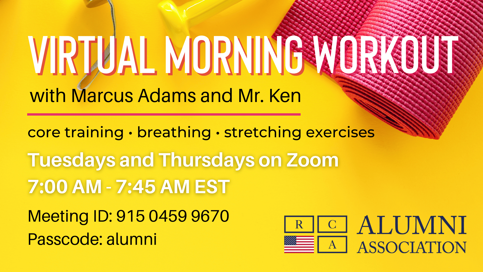 Join us Tuesdays and Thursdays at 7:00 AM EST/6:00 AM CST for our special Virtual Morning Workout series with Marcus Adams and Mr. Ken from RCA Capital Region.
