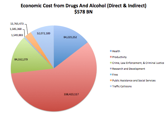 - Traffic – 22% of all traffic costs can be attributed to alcohol, which totals to over $50 billion dollars in economic cost. This value does not address drugs and therefore is likely undervalued.